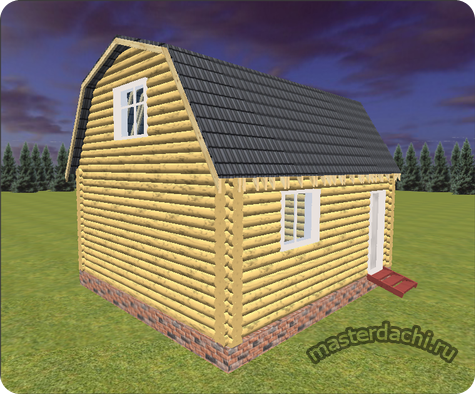 В проекте дачного дома, предусмотрены основные элементы: ленточный, заливной фундамент, коробка стен с одной перегородкой из бревна, мансардная крыша без утепления. Ленточный заливной фундамент, является крепким для строений из рубленого бревна, более того дачу можно использовать для проживания круглый год. Перегородка смещена к выходу для того чтобы увеличить гостевую комнату (расположение перегородки можно изменить)