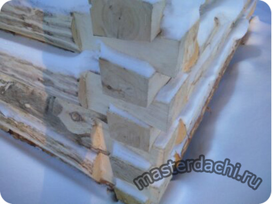 Сруб бани из бруса сечением 150х150 мм производится на высохший и гидроизолированный фундамент. «Коробка» бани из бруса обязательно собирается с использованием утеплителя. Углы бани по желанию можно обрубить «в лапу» или «в чашу» (точно так, как и при строительстве бани из рубленого бревна).