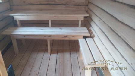 На выложенные из кирпича тумбочки устанавливаются половые лаги из бруса 50 на 150 либо 100 на 150 мм в зависимости от строения. Затем укладываются обрезные половые доски толщиной 40 мм и шириной 150 мм. В процессе строительства бани из дерева половая доска строгается с трех сторон и снимается фаска для беспрепятственного стека воды. Между досками оставляем щели по 1 - 2 см для того чтобы вода не задерживалась и утекала в сточную яму бани. Материалом служат хвойные породы древесины (сосна, елка)